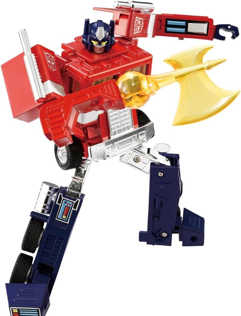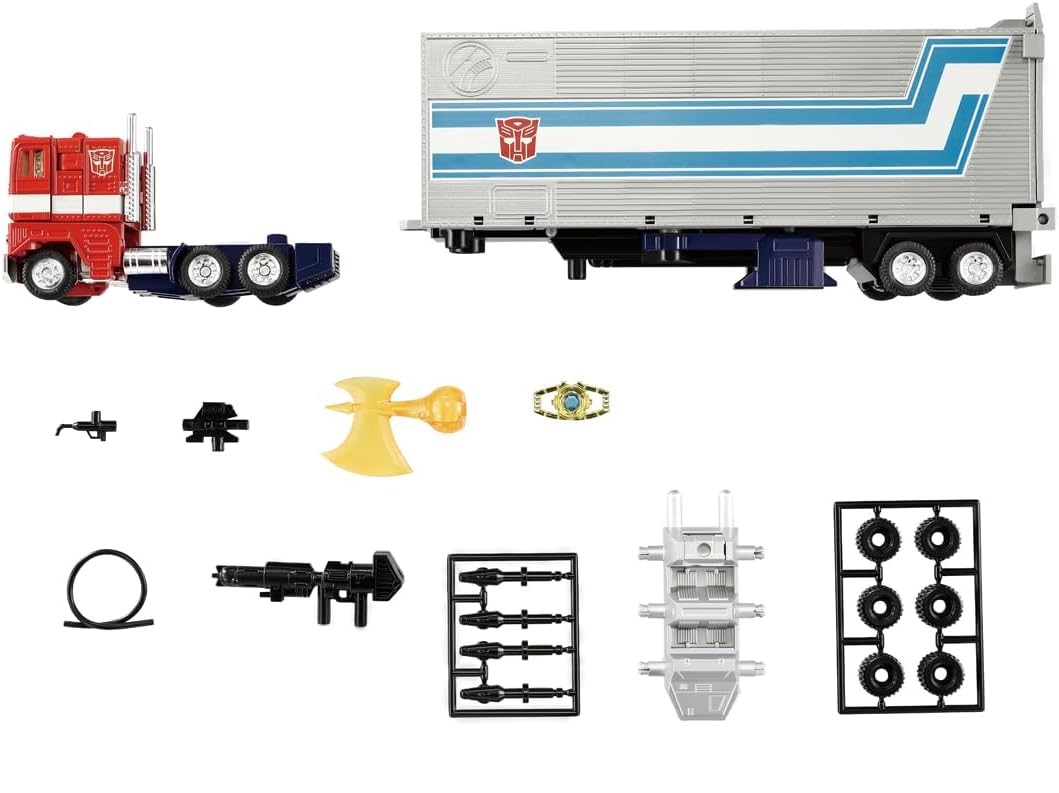 Missing Link C-01 Optimus Prime with Trailer - Upgraded version of the original G1 Optimus Prime with added articulation to become fully poseable. Paint scheme based on the original toy colors. Includes several accessories. Made by Takara.